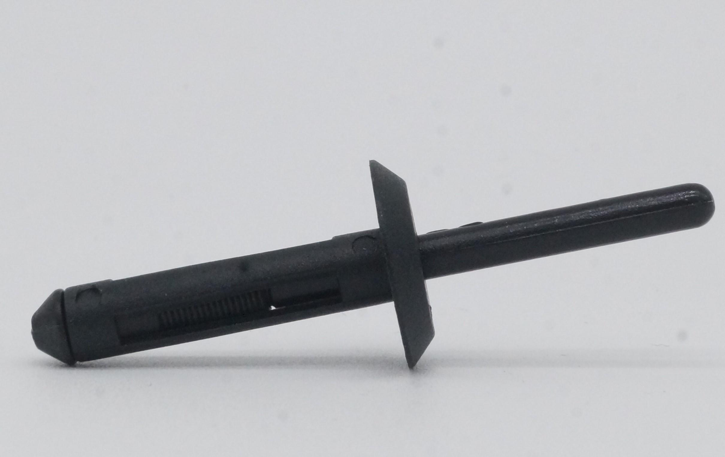 Remache universal para carrocería Chevrolet, Ford y Dodge. Fabricado en nylon automotriz, con dimensiones estándar Ø ¼" (6.30 mm) y longitud de cabeza de ~11.90 mm. Ideal para sujetar partes de carrocería como paneles, defensas o áreas que requieren remaches de presión.